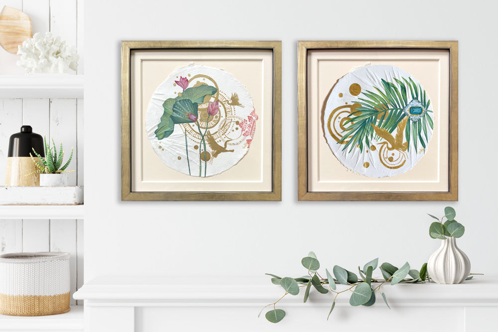 This artwork on paper brings elegance and warmth to any private or public space through refined textures, balinese motifs, graphic sunbursts, intricate botanical drawings. Her harmoniously dynamic compositions radiate a sense of balance, beauty, and vitality.