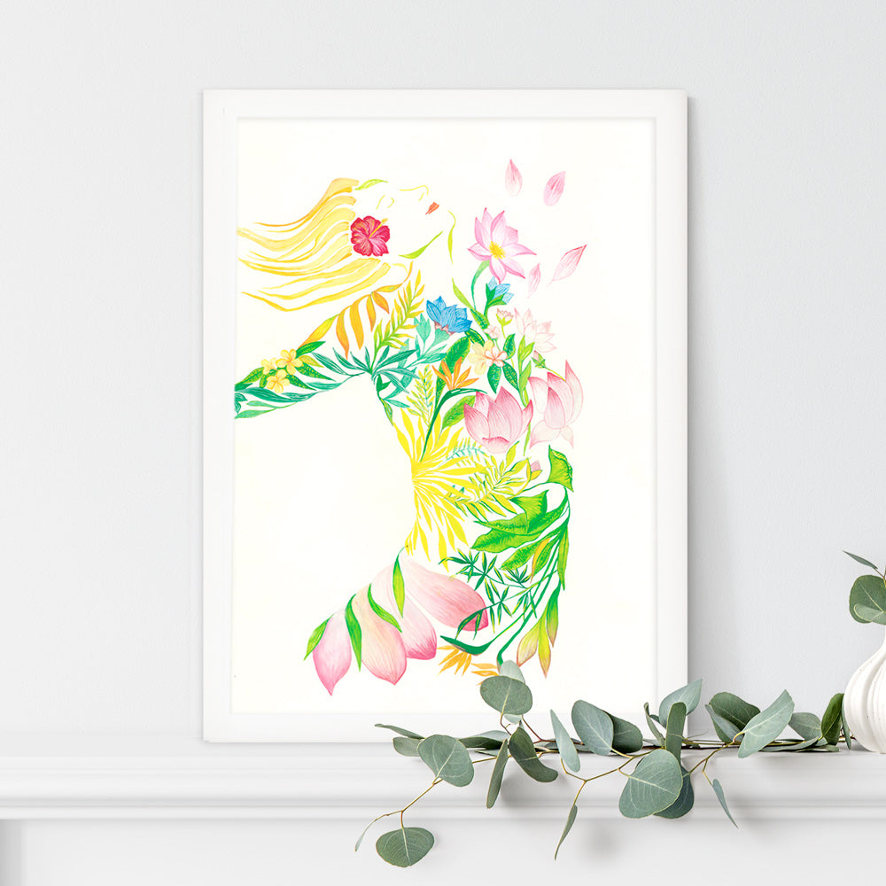 There's a sense of freedom and joy when you connect to nature. Botanical figurative art print inspired by Bali. Available as a limited fine art print. Originally intricately hand-painted with gouache and reproduced on German Gyclée Bamboo Hahnemühle paper 310gsm.