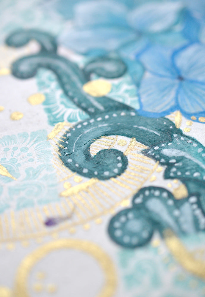 Gouache, ink pencils, rubber-prints, embossing and metallic gold acrylic